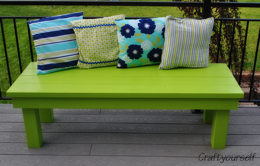 Update on the wood bench!! It has now been 5 years since I posted about this bench and it is still as strong as ever. The paint started getting sun faded this past summer so hubby lightly sanded it and added a new fresh coat of paint. The pillows have been replaced by other pillows as the original one’s had sun faded also. But I am still as in love with this bench as I was the day he finished it!