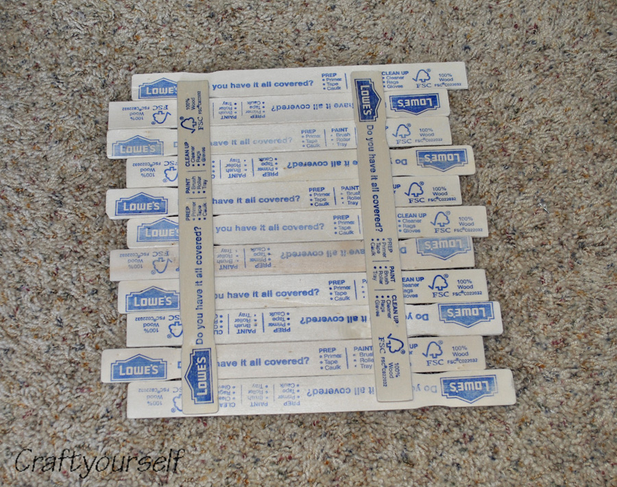 Take about 10 to 12 paint stir sticks and line them up. (but don’t line up the handle part to match) If you do line all the handle part of the stick it may look funny. I staggered mine and you can see how I used two paint sticks to glue the other sticks together (this picture is a back view of how it should look when all glued together)