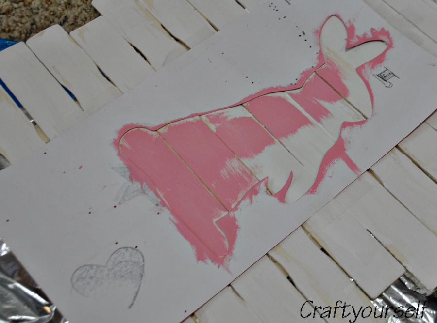 Once they are all glued together I did a light coat of white paint. I even left a few parts bare to show the natural wood. Next step is to create a bunny template on the cricut and tape down to the painted wood sticks