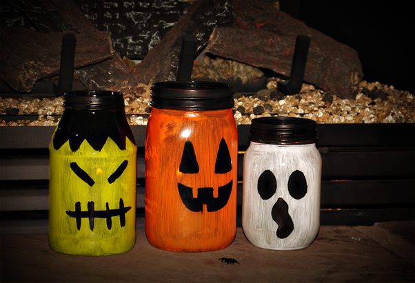 Here is my version. I took 3 glass mason jars and painted them different colors using the gloss decoart paint. once dry I painted on black eyes, hair, etc. on each jar. Once dry I sprayed each jar with a clear epoxy seal coat to give them a smooth shiny appearance.
