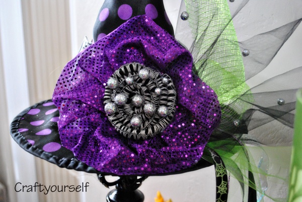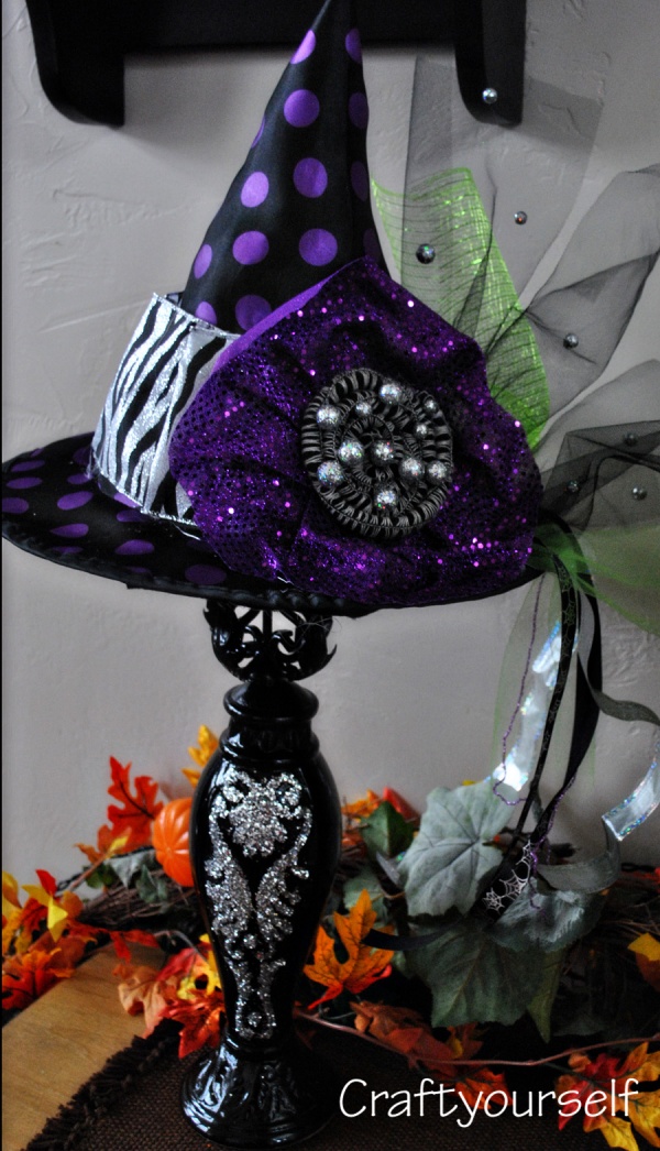 The Witch hat is from the dollar store.. Yep you heard that the dollar store! It is stuffed to keep it standing up. The opening of the bottom of the hat is covered with black felt. The black felt keeps the stuffing inside of the hat and works as a base to glue onto the candle stick.