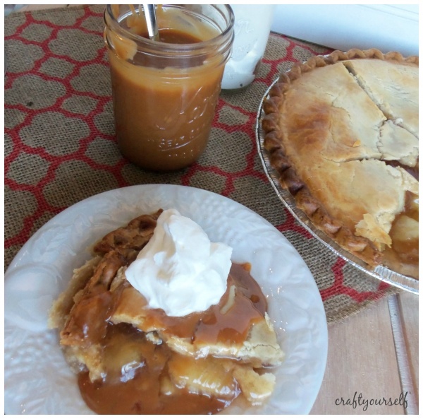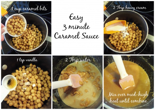 I still had some time on my hands until our pie would be done and guest would be arriving. I also noticed that I had a bag of caramel bits in my pantry. I pulled them out and placed 1 cup of caramel bits, 2 Tablespoons of heavy cream, 1 teaspoon of vanilla and 2 tablespoons of water into a sauce pan. Over medium heat, I stirred the caramel bits, cream and water until they combine into a caramel syrup!