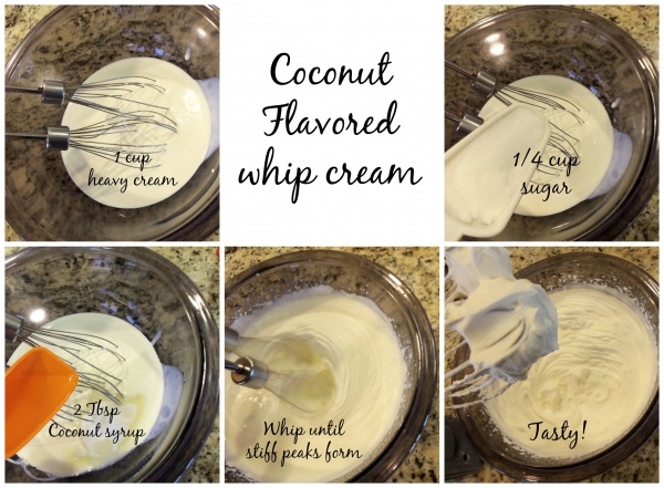 With the timer counting down I still had about 25 minutes until we would be ready to serve our pies. I always love fresh whipped cream on top of my pie! I pulled out my heavy cream and started to got it ready to whip. While I was getting the sugar out of my pantry right in front of me was a bottle of coconut syrup. I thought that might it be fun to have a coconut flavored whip cream. I pull out the syrup along with my sugar and got to work. I put 1 cup of heavy cream, 2 Tablespoons of coconut syrup and a 1/4 cup of sugar into a bowl. I used my hand mixer on high with my whisking beaters to whip the cream. It took about 3 minutes for the cream to form stiff peaks.
