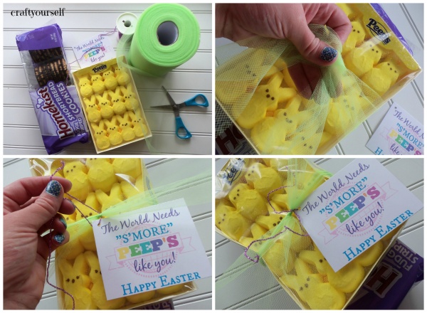Last week we introduced our “The world needs S’more PEEPS like you” tag. This week I needed to round up a few fast gifts to drop off to some friends and neighbors. I was short on time and wasn’t able to whip up a batch of the S’more bars from this post. I stopped off at the store and purchased a few packs of the fudge striped cookies and a couple of packages of PEEP’s. I tied together the PEEP’S and fudge stripe cookies and attached one of our tags with some ribbon.