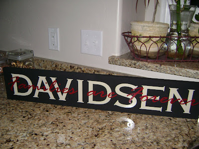 This literally takes about 45 minutes and most of that is drying time of paint. Took a board painted it black and let it dry. Measured the board for vinyl Using their Last name in cream color then adding “families are forever” over the top in deep red vinyl. Super easy!