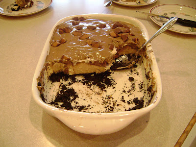 Yum, that dessert you made for us was sooooooo yummy, my mouth started watering seeing the picture of it. I'm glad you put the recipe on here. Although I think it will have reverse effects on me, than it has on you! 🙂 That cake looked so yummy too. You know, if Justin is sick of being the food tester, I'd be willing to come over anytime you need me to. 🙂