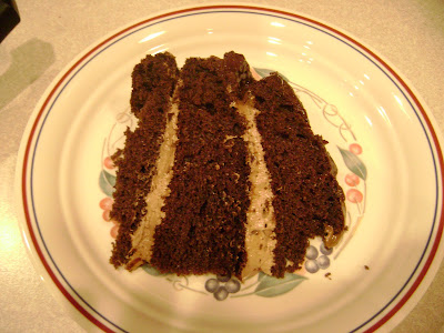 place one layer on cake plate and spread a layer of mousse filling on top. Top with second cake layer. Again spread with mousse. Top with final cake. DO NOT put mousse filling on the top layer (I learned this the hard way as my glaze ran off the top)