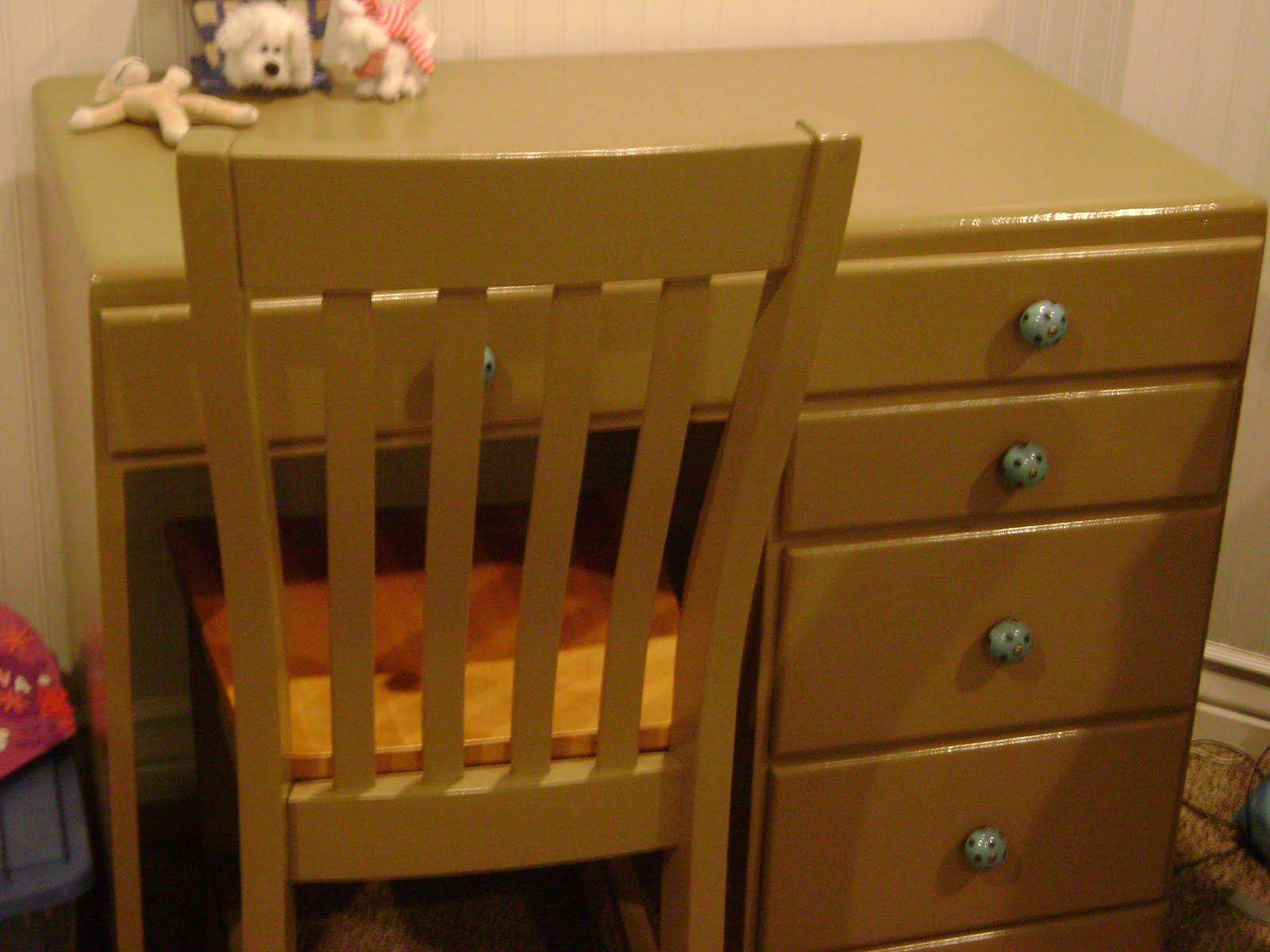 I picked up these cute little knobs from Hobby lobby when they were 50% off! My brother had two chairs he was getting rid of that were painted a dark forest green so I took them both and sanded down one of them and repainted it to match her desk. I would still like to put a fabric cover over the seat but I just haven’t found the perfect fabric for it. Here are the finished pictures!