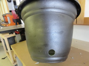 She took the green pot and drilled a hole in the back of the pot for the fountain cord she then found some old spray paint she had out in the garage and spray painted the pot .
