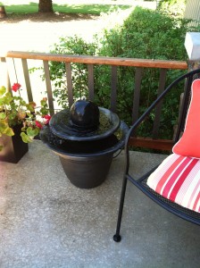 She cleaned up the bowl of the fountain and since it was heavy enough she just set it on top of the pot. If you wanted it heavier you could always fill the pot with rocks or some sort of weight. Once the pot was dry she placed the bowl on top of the pot and filled it with water, plugged it in and look how pretty it turned out!