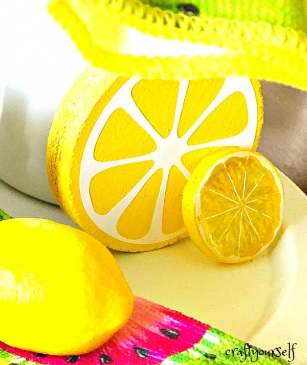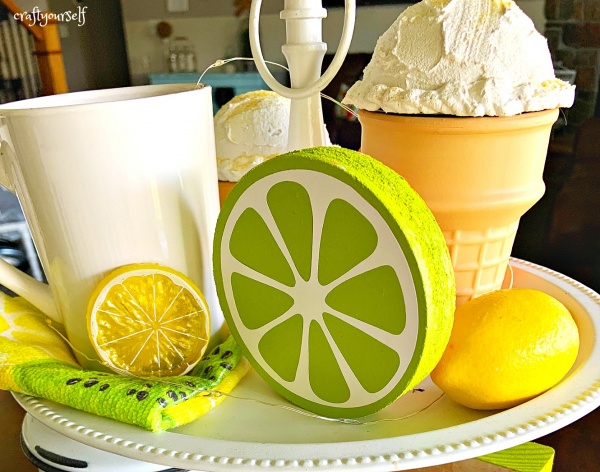 Have you jumped on the tiered tray decor craze yet? Last year I bought myself a small tiered tray and fell in love with them. I got my tray at the beginning of the summer and styled in with lemon decor. Since then I have purchased a second larger tiered tray. As the summer came I realized I didn’t have anything to fill my new large tray with. I started looking for small items to create a fun summer tray. Instead of all lemons in this tray, I went with assorted summer fruits. I am loving how it’s turning out. I created some round citrus fruit slices to stand up in the tray. These are a fun and simple project to add a splash of summer decor to your home.