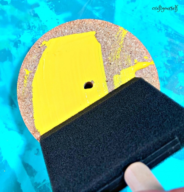 Start by cutting your wood into circles using a drill bit or paper template and jigsaw. Then paint each circle your desired colors (I choose orange, yellow, and lime green)
