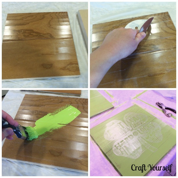 Next I applied a layer of white paint over the contact paper template. I used the same streaky style as I did for the base coat. Leaving some of green showing through. After the white paint is dry and set, peel off your contact paper template. After I had completely peeled off the template. I did have some places that bled through. I decided to leave it like it was, I am going for the “rustic look” I love how it turned out!