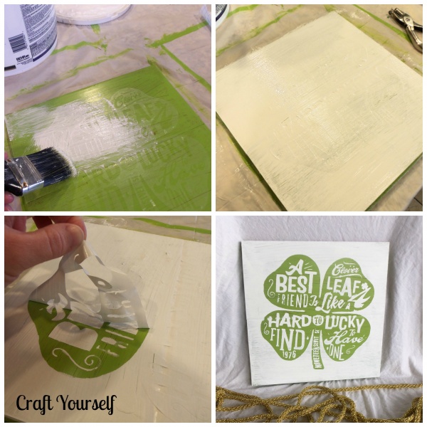 First I grabbed 2 pieces out of my wood flooring pile (I love having scrap wood hanging around) I glued the 2 pieces together, to make this square board. Next I gave it a light sand. If you have a piece of raw wood, you probably could skip this step. The paint won’t stick to the finish on the wood flooring. After sanding, I painted a streaky base coat of green. I am going for rustic, so I wanted some of the wood finish showing through. After I let the base coat completely dry, I placed the contact paper shamrock template on the center of my board.