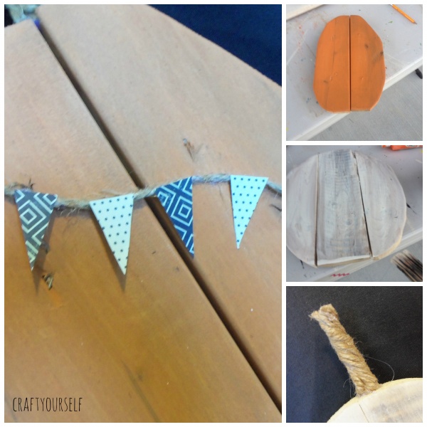 I placed 3 boards next to each other and then traced a pumpkin shape around the boards, I also took 2 more boards and placed them side by side and traced another pumpkin shape. Next I used the jigsaw to cut out the simple pumpkin shape. Then I used 4 scrap tack strips and nailed them on the back of the boards I cut to keep the pumpkin’s shape. I white wash painted one pumpkin orange and the other on an off white. After they were dry, I made stems for each pumpkin using twine and hot glued the stems onto top of the pumpkin shapes. I felt like they still needed a little something so I created the small pennant banners out of some scrap patterned paper. I love how rustic they turned out!