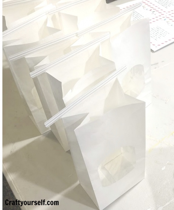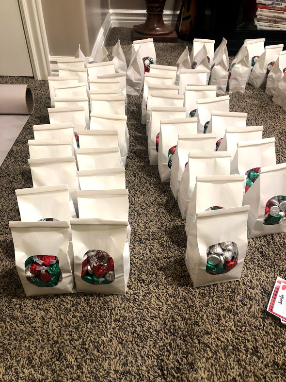 We filled each one until the Hershey Kisses came just above the little window opening. You could always add tissue paper in the bottom of the cute bag to make the kisses stretch further.