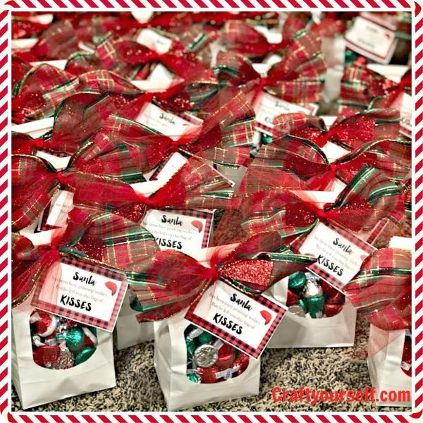 I always try to figure out a Christmas game plan for my neighbor’s & friends a year in advance. The reason I do this is because the sales after Christmas every year are worth watching. I found this cute Santa Kisses Printable from A pumpkin and a princess a year ago! I jumped on the idea and Krystal found Hershey kisses for 90% off after Christmas last year. Making each bag only around .30 cents per bag!