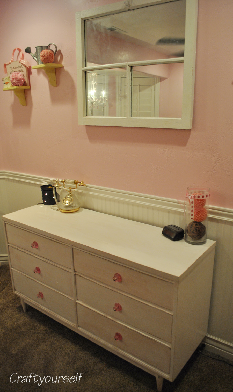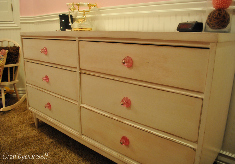 I sanded for about two hours then decided it was good enough. I vacuumed up my large amounts of sanding dust, cleaned all the excess dust off of the dresser and drawers then headed to Hobby Lobby to check out their knobs. Maeli’s room is done in pink and her theme is shabby chic’ she has a cute pink glass chandelier that hangs above her bed so she wanted knobs to match. She picked up the cutest ones (and we got them 50% off).