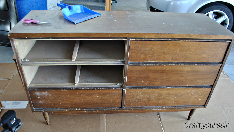 It had major potential! I scrubbed it down and even had to use goo gone and a scraper to get rid of some sort of spilled gummy substance that was on the top. I then began sanding and sanded some more. Then Sanded even more. I had to get rid of all these little dents!!