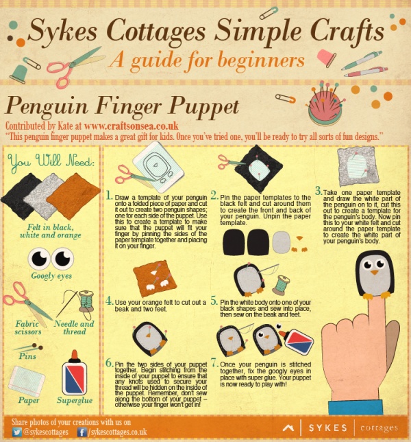 To encourage you to give crafting a go, Sykes Cottages have created a series of simple craft tutorials that are easy to follow and require few specialist tools and materials. The guide features six fun tutorials, with creative crafts ranging from a penguin finger puppet to a crochet tablet cover, all of which are simple and inexpensive to make.