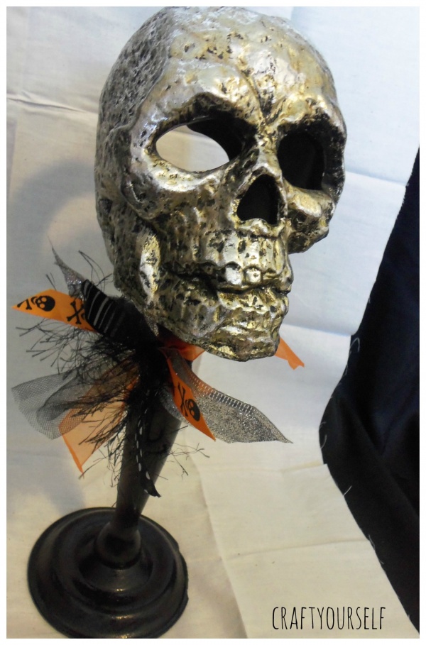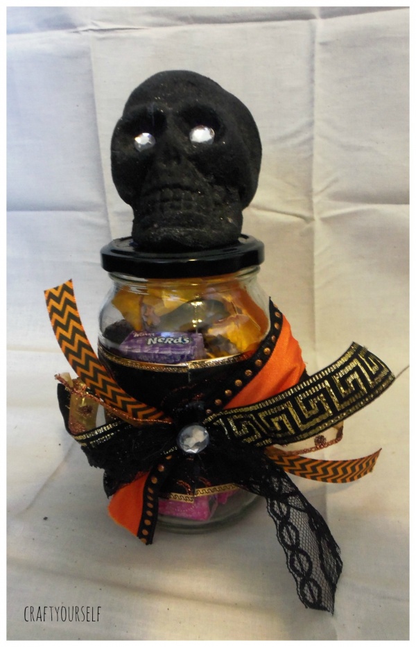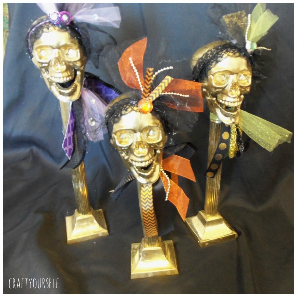 This year we were on a skull kick. I found skulls for 90 percent off last year and several more at yard sales through out the summer. One of our favorite ways to use up all of these skulls was to put them on top of candle sticks and jars. We painted a bunch of the skulls with gold spray paint and others we glittered in black. We had a huge variety of skull themed prizes to give away at our Halloween party this year. The next time you see a skull think of the fun ways you could transform him.