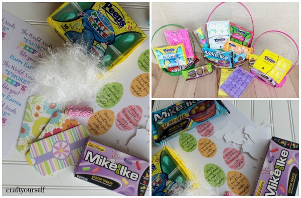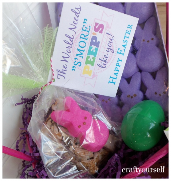 For gift giving we put a bar inside of a clear cellophane bag, tied it up with ribbon and attached a cute printable that we made that says: “The world needs S’more Peeps like you!”