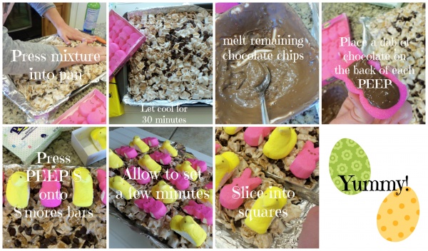 Let the pan cool until room temperature then cut into squares! To add a little Easter flair to these S’mores bars we dipped the bottom of Peeps into melted chocolate and then set them on top of each S’mores bar. (P.S. we doubled our batch)