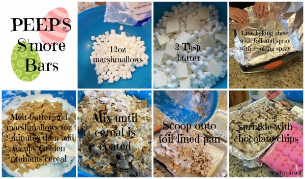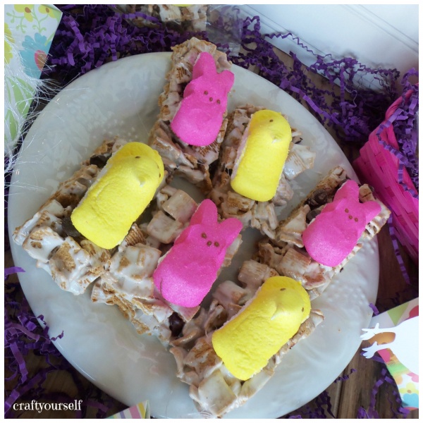 With the huge assortment of flavors and Classic colors to choose from I knew I needed to get creative with the peeps this year. First off Krystal and I got together and whipped up some awesome ideas! When we create crafts or treats we always keep in mind who we would like to give them to. So we created our recipe and ideas around gift giving. First we made the ever so awesome S’mores treat out of Golden grahams cereal. First you take 1 12 ounce bag of mini marshmallows and melt them in the microwave along with 2 Tbsp. of butter. Once they are melted stir the mixture into a bowl full of 6 cups of Golden Grahams Cereal and stir!!! Keep stirring until all the Golden Grahams are coated in the marshmallow mixture. Once coated spray your hands with a bit of pam and mold the mixture into an 8 & 1/2″ x 11″ greased pan and sprinkle a bag of chocolate chips onto the top. The mixture should still be warm enough to melt the chocolate chips just a little.