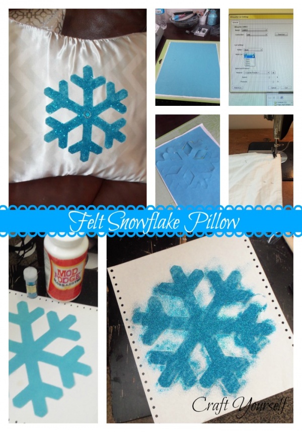 Avry and I decided to make some fancy snowflake pillows as a girl can never have too many pillows! Plus like I said before, pillows can change the feel of a room. We used the same envelope style to make all these pillows. For the first pillow, we chose a white satin fabric, then I pinned and sewed my envelope pocket on the back of the pillow. Next I used my silhouette machine to cut some blue felt into a snowflake design. Did you know your silhouette can cut fabric too? This was my first time using my machine to cut fabric. I will do it again! So easy, I found a great tutorial on how to cut fabric