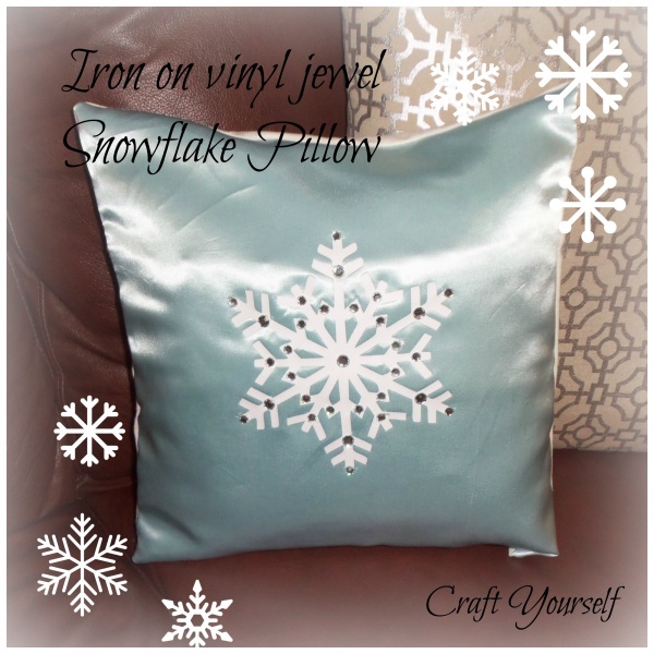 For the third pillow, I picked out a light blue satin fabric. Once again I used the envelope pocket for the base. I cut this fancy snowflake on the silhouette machine with heat transfer vinyl. I ironed on the snowflake and then placed and hot glued jewels onto the pillow. Another fun fast easy pillow project.