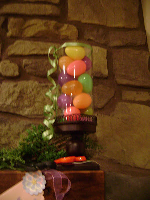 I had some hurricane candle holders that have always had candles in them. I took the candles out and put in some cheap plastic easter eggs!