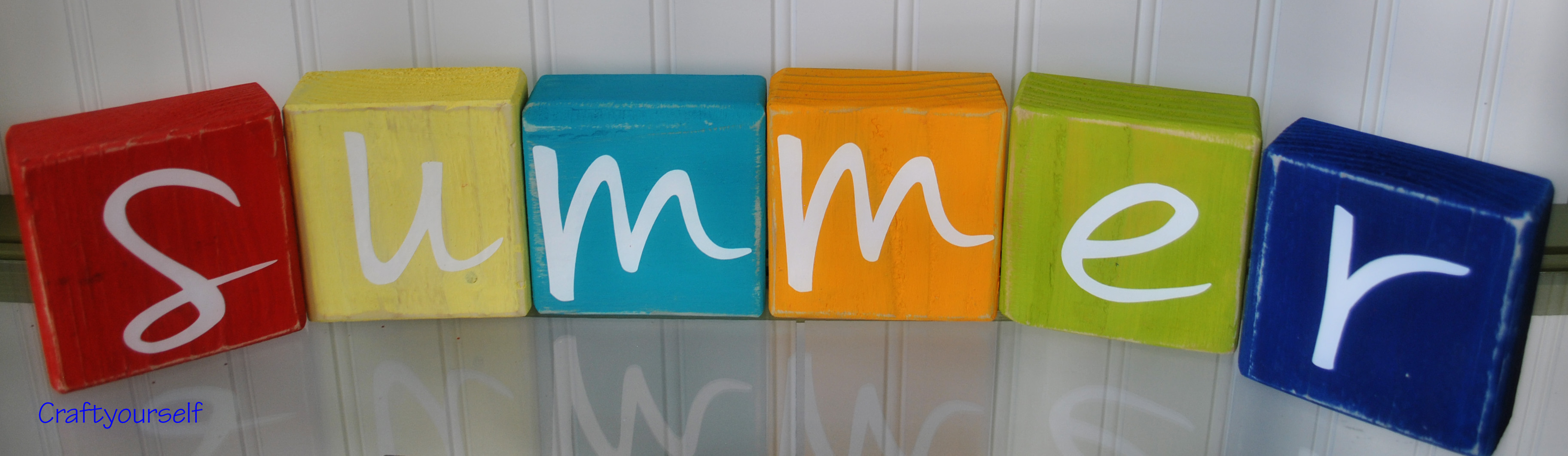I painted the left over blocks I had from this Christmas project the blocks were cut from 2″ pine and we cut them into 4×4 squares. I painted them different colors and sanded the edges. Krystal came up with a cute font and whaa laa we have a super easy summer craft!