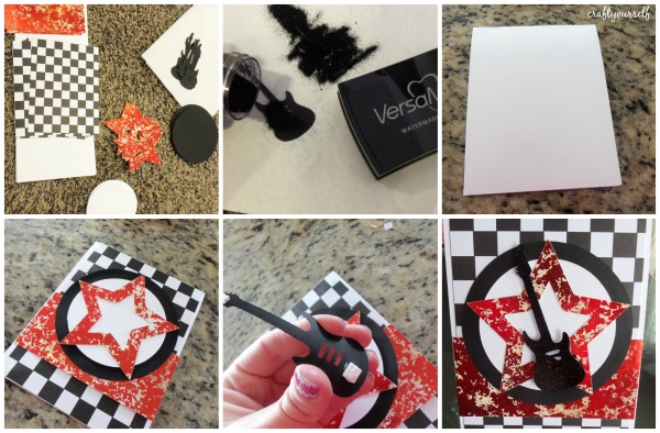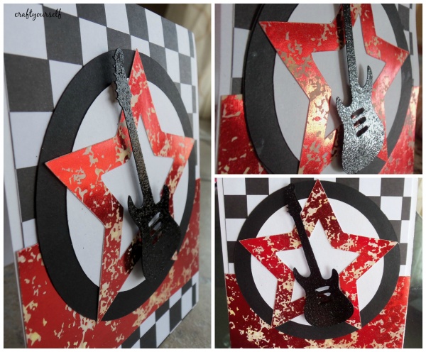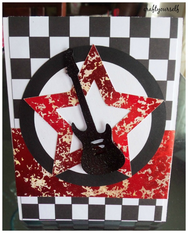 I cut the card base out of white cardstock I then layered a black and white checkered paper on top of my card base. Once that was on I cut a rectangle red foiled accent piece of paper using my paper cutter and layered that on top of the checkered paper. The guitar, circles and star I cut using my personal cutting machine.