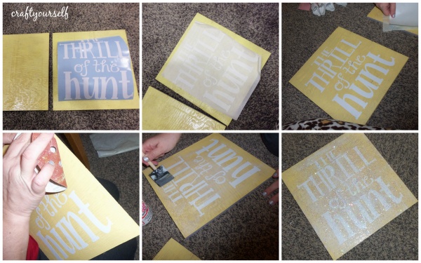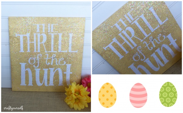 With Easter right around the corner, Avry and I decided we better get to work and come up a few new fun items to add to our Easter décor. You all know how much we love vinyl! It is just so easy to work with. Often Avry and stockpile wood scraps, if we are painting some for a project we will often paint a few more boards. It is really nice to have pre-painted boards on hand. We usually try to have white and black pre-painted boards on hand and a few colored ones. A couple of weeks ago we painted several boards in spring and bright colors in preparation for Spring and Summer. I am so glad that we had these boards pre-painted. Even though this is a really simple project to start with. We would have had to wait an hour or so for our boards to dry. For this project Avry and I selected 12″ by 14″ boards we had pre-painted yellow. I typed and selected the fonts in my computer program. Then we cut our The thrill of the hunt wording our of white vinyl. Next we centered and applied the white vinyl to our yellow boards. Last we painted a layer of Mod Podge over our entire board and then sprinkled a iridescent glitter over top.