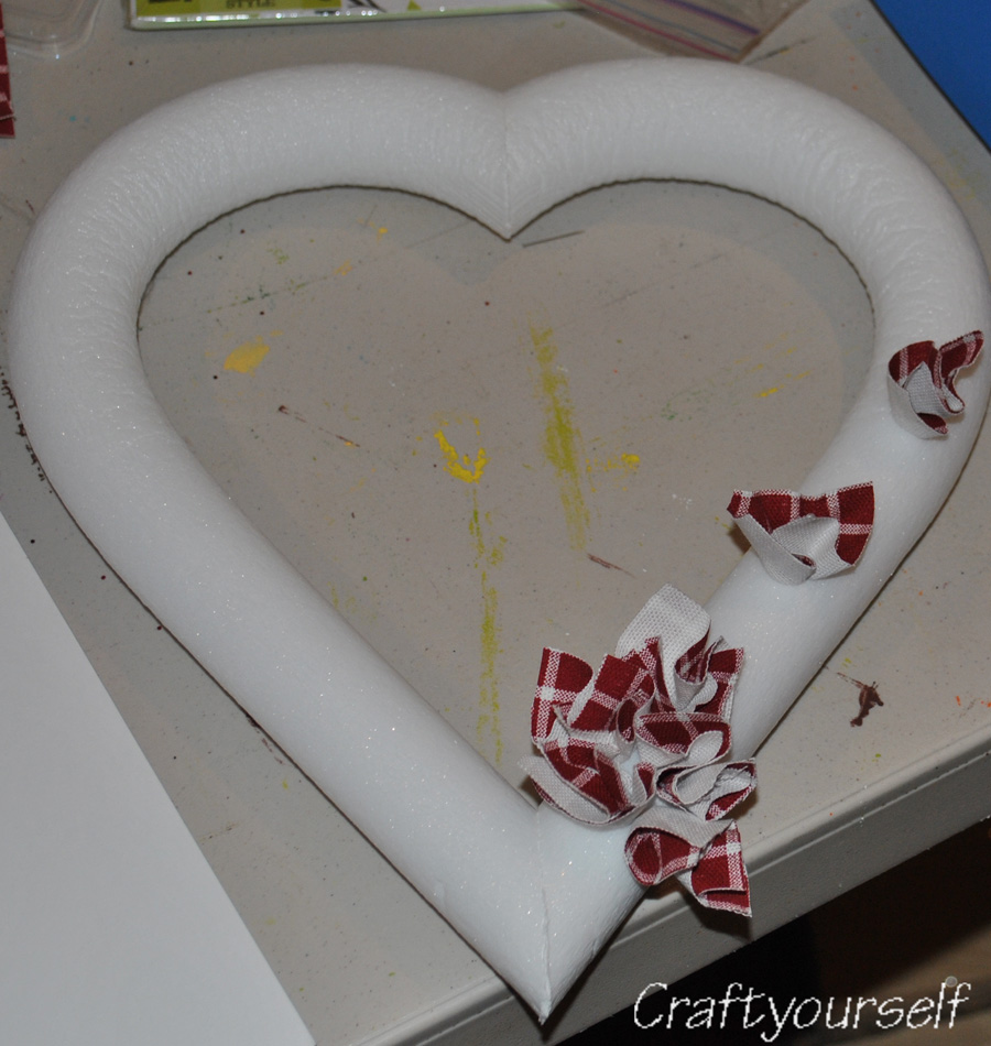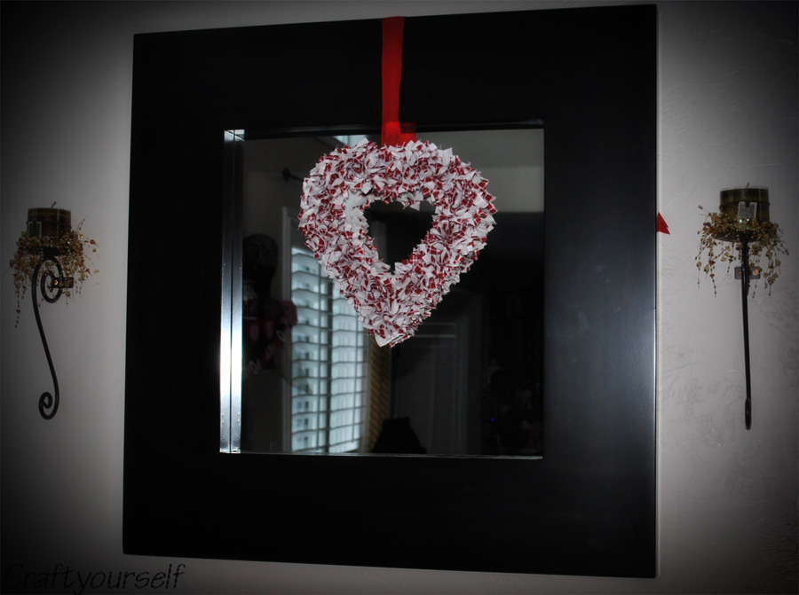 I found this idea on Little Birdie Secrets and followed her tutorial just as described. It was super fast and super easy! I do have to admit though tracking down heart shaped foam wreaths was difficult. NO ONE carried them and it took me looking at three different JoAnn’s stores to finally find one!