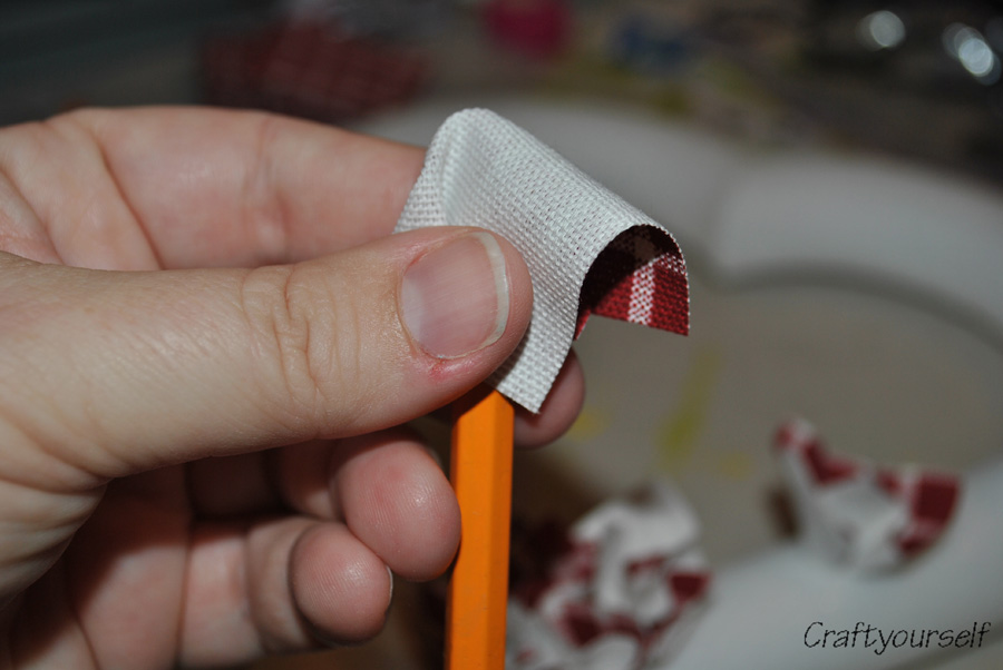 I had some scraps of fabric that I had purchased at a garage sale last summer to make this wreath. I used my cutting mat to cut the 2×2″ squares. The cutting of the squares went really really fast. Once all squares were cut I used a pencil, wrapped the fabric around the tip of the pencil and began poking those squares into the wreath.