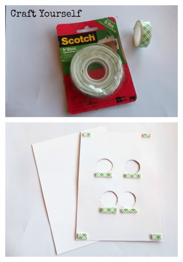 I used this Scotch brand foam mounting tape. You could also use glue dots or any product that will give a little height and help hold the quarters in place. Place your mounting tape under each cut out circle and on the four corners on the backside of the printable. pull strips to show adhesive and attach to the plain cardstock you to cut to match.