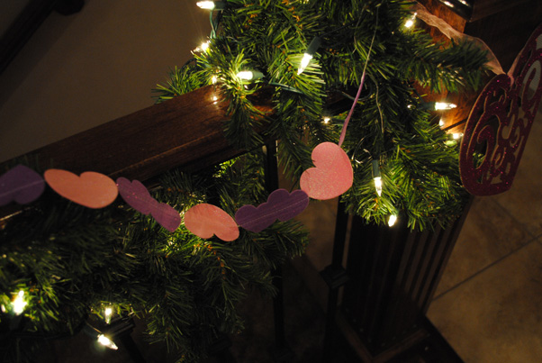 I still had some pine garland up from the holidays so I took off all my Christmas decor and jus added the heart garland and hearts to the pine with lights. Cheap idea to help decorate your house for Valentines!