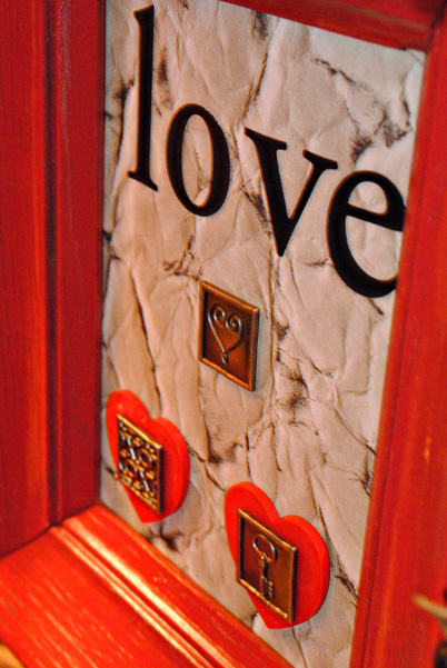My mom and I found oodles of odds and ends at a garage sale and the lady was charging $5.00 for a full bag so we loaded up. I have used multiple items out of this bag including 2 small wooden hearts in which I painted red. I glued the hearts onto the scrapbook paper under the word love then embellished the hearts with small metal scrapbooking plaques that I also had in the garage sale bag.