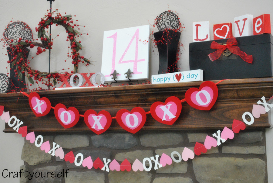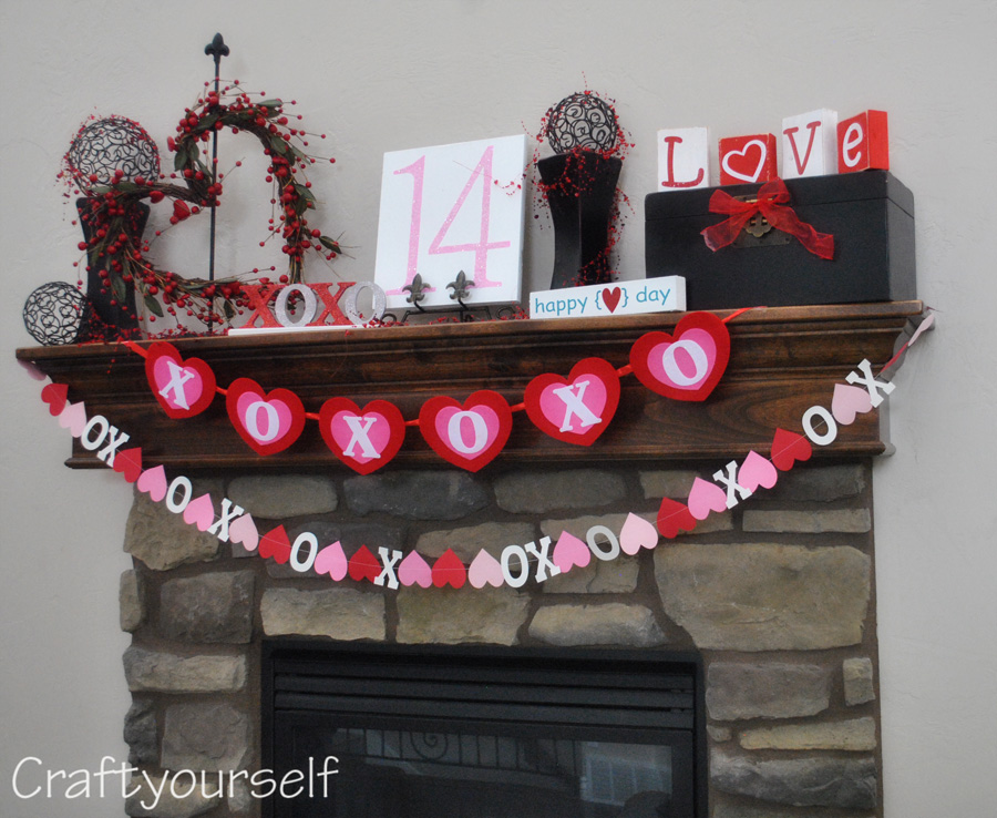 The Garland with hearts and X’s and O’s is done out of colored cardstock, cut on the cricut then just one solid string of sewing on the sewing machine. The felt Banner was purchased last year in the target $1.00 section. Honestly I couldn’t make that for $1.00 so I bought it!
