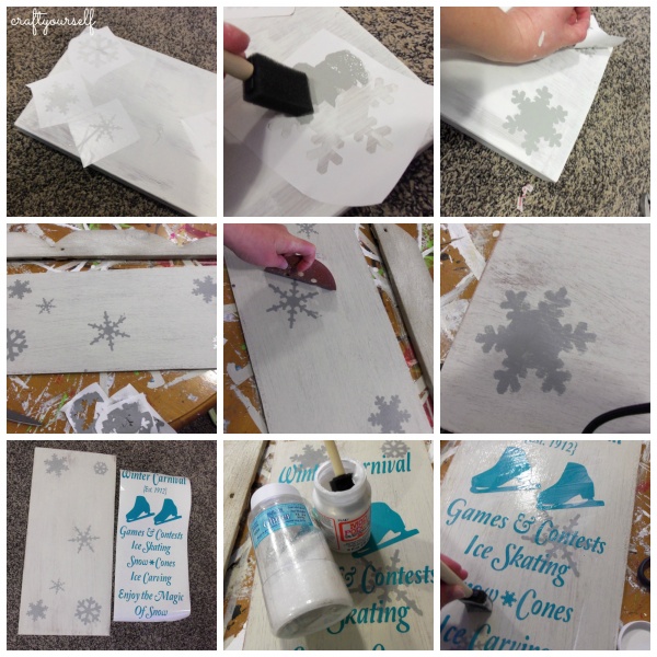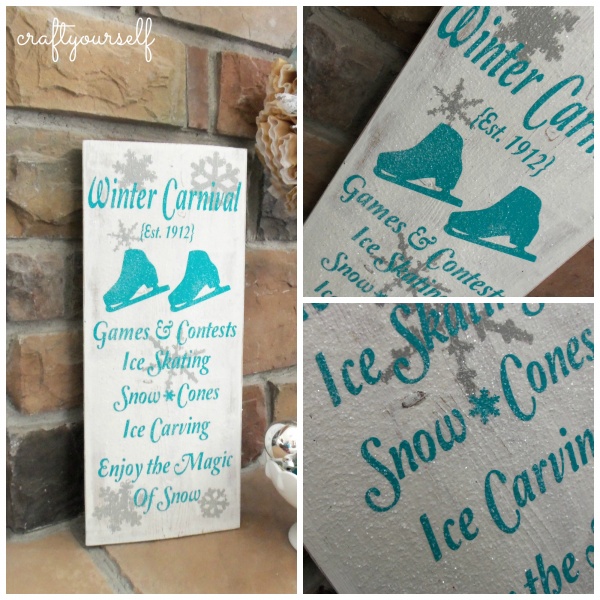 I have been feeling like my January décor is still lacking. I have been looking for ideas to add to my home décor. I came across a vintage winter carnival design online. I really liked the idea. The sign I found had a lot of yellow and red in it, I wasn’t really digging the color scheme it was done in. I decided to design my to own to fit with my blue and white winter décor for January. I used most of the same wording and added a few of my own ideas to the winter contest area of the board. I designed the wording using my personal cutting machine, and cut out the design on teal vinyl. I painted a 22″ X 10″ board white, while the board was drying I cut out a few different designs and sizes of snowflake templates. I placed the templates all over the painted board and sponge painted the snowflakes gray. Next I gave the board a quick sand to give it a vintage feel. I centered and applied the vinyl design. Last I covered the board in Mod Podge and sprinkled a clear glitter over the entire board to give it a snow or icicle effect.