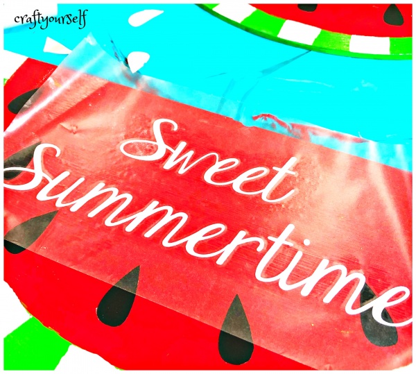 While your watermelon is drying using your personal cutting machine design and cut several black seeds about 1″ size. Also design and cut the saying “Sweet Summertime” in white vinyl.