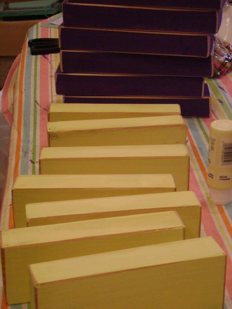 My mom picked out 3 colors that would coordinate with her table decorations and I painted them the colors she chose. We used a 2×4 cut into different lengths. I believe our lengths were 6″, 5″ and 4″ So the blocks can stack ontop of one another.