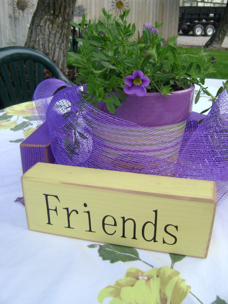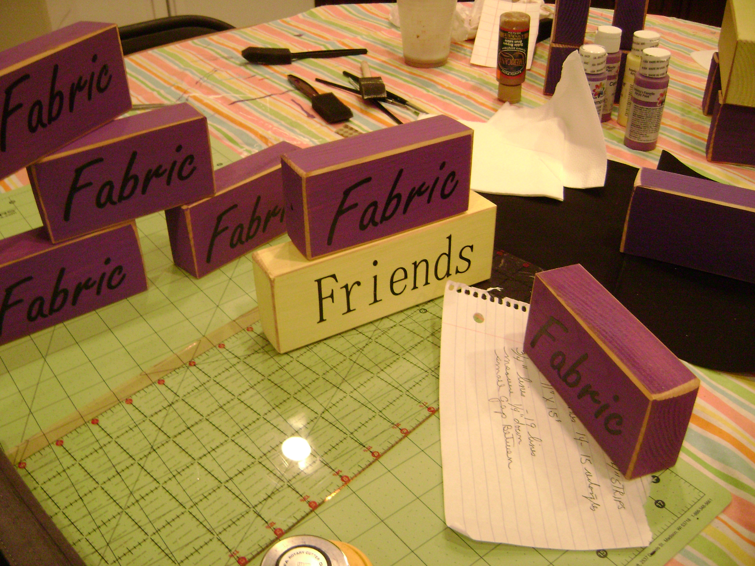 Paint them, sand the edges, antique them with light brown stain and add whatever sayings you want to. For these blocks since they were for her Quilt Guilt we used the words, Friends, Flowers and Fabric. They were gathering with their friends in one of the ladies flower gardens and of course discussing fabric! They made darling centerpieces that were given away as gifts at the end of the event.