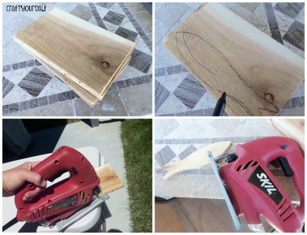 I went through my wood scrap pile and found all of these pieces of redwood fencing, the pieces aren’t very big they measure between 5 and 6 inches long and about 5 inches wide. I free-handed 2 fish on each board, then using my Skill saw cut around the fish shape. This took all of 10 minutes to draw and cut 6 fish out. It really is easy to use the Skill saw and the fish don’t need to have perfect or straight lines.