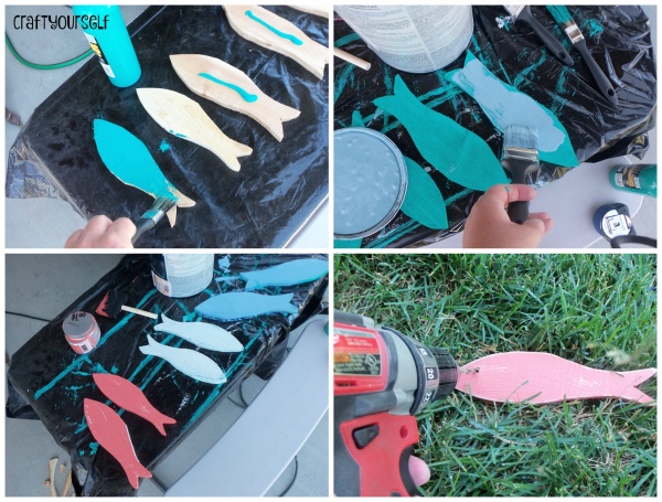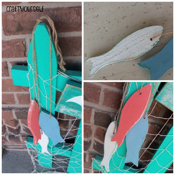 Next I painted all the fish a teal color and let them dry, after they were day I painted over the teal color with white, light blue and coral colors. I let the 2nd coat of paint dry and then sanded off the edges to reveal the teal color and some of the wood. Last I used the drill to make a hole where the eye of the fish would be and then strung some jute through the hole and tied the jute together to make a bundle of fish!