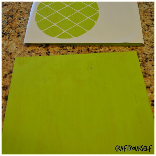 I made this simple enough so even a beginner could follow my instructions and create their own. I started out with a 12″x 12″ plywood board and painted it a lime green. I decided on the 12″x 12″ size because it would match the cricut mat size to make it easier for sizing purposes. Next I found a pineapple on Google images that I liked and imported it into the Cricut design space. I love that Design space allows almost any type of file to be uploaded now. It take away a lot of headache from having to convert images to an SVG file. I think this file was a Jpeg. Which was easy! I manipulated the Pineapple to the size I desired and cut it out using contact paper.
